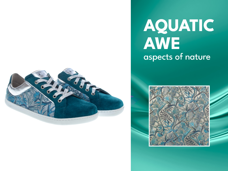 A color inspired by nature, the depths of the ocean, and lush forests. We have infused this shade into a natural pattern of leaves and flowers, blending fresh tones of petrol blue, green, and turquoise. This unique pattern stands out beautifully on the FARE BARE ELEGANT PETROL BLUE SNEAKERS, bringing freshness and originality to any wardrobe. These shoes pair well with both elegant and sporty outfits.